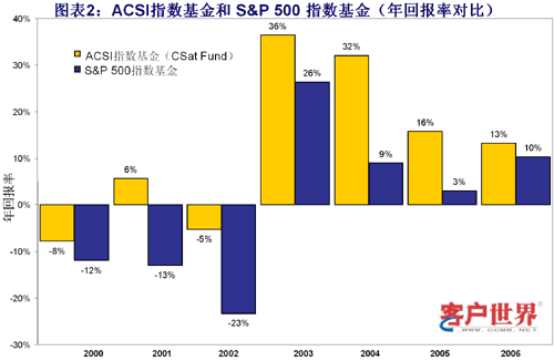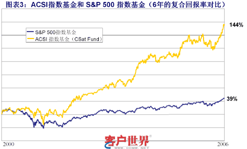 那么,以ACSI测评结果为基础的股票投资组合是否真能获得比大盘指数基金更高的回报呢?答案是肯定的。科罗思·费耐尔教授在2000年创立的ACSI指数基金(Csat Fund)已经充分证明了这个结论。ACSI指数基金(Csat Fund)的主要投资策略就是不断地买入客户满意度高的公司的股票,同时不断地卖出客户满意度低的公司的股票。在制定此交易策略时,不采用其他任何数据和信息;也就是说,它纯粹地依赖上市公司ACSI客户满意度信息。从2000年到2006年,ACSI指数基金(Csat Fund)每年的表现都要优于美国标准普尔500(S&P500)指数基金(见图表2)。而且,ACSI指数基金(Csat Fund)6年的总体表现就更胜于美国标准普尔500(S&P500)指数基金(见图表3)。