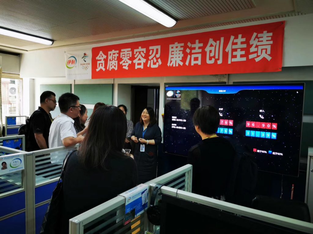 伊利奶粉客户服务中心管理团队接待评审团考察,朱秀明女士就整体运营情况及管理特色进行了详细的介绍,评审团专家与伊利奶粉客户服务中心运营团队进行了充分的互动和交流。