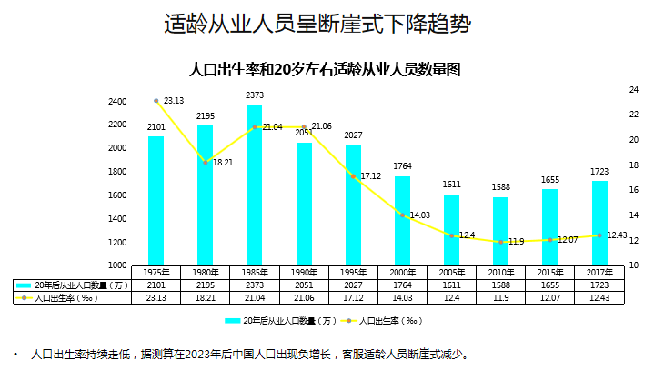 从人口出生率来看,自2000年开始,适龄工作人群数量大幅下降,之后每年的下降数量稳定在1500-1700万。近五年人口出生率的统计分析,未来5-10年,中国适龄劳动力可能进入新低谷。人力稀缺、培养成本高,使得客服产业发展形势日益严峻。