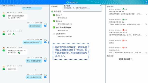 另外,对于简单的维修预约流程,智能客服助手可以实时帮助客服人员应答。当遇到客服新人,智能客服助手在服务过程中会提醒他各种话术。质检机器人实时质检服务情况。案例中,客服人员最后没有问客户预约时间,质检认定结果为“本次服务有缺失”。客服新人初次使用智能客服助手,就可以勉强完成陌生业务。人机融合的方式能很好地帮助客服中心提升效果,当然还需要配置得更强大。