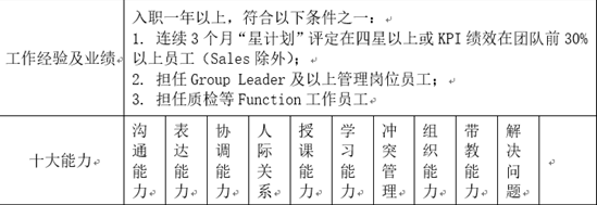 如上是笔者曾经服务过的呼叫中心内训师任职资格。我们可以看到,内训师的任职资格可以拆分成工作经验/业绩和能力要求这两大部分组成。而在工作经验/业绩模块,则会和双轨制评定中的岗位技能评定挂钩。这也保证了所选拔的内训师的业务能力。