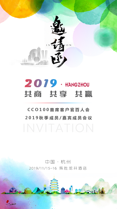 首席客户官百人会(CCO100)现拟定于11月15-16日召开2019年度秋季成员及嘉宾成员联谊活动,共同探讨共享经济时代众包模式的发展趋势,同时就2020年度CCO活动计划进行商讨。