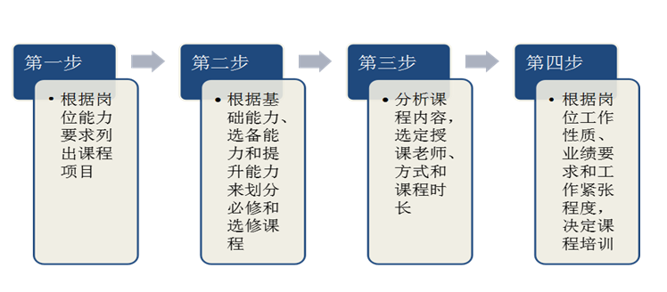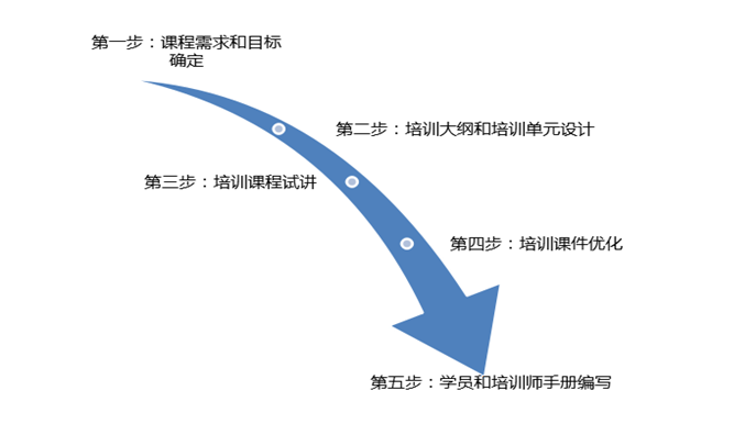 2.培训课程体系。课程的设计直接影响到培训的效果,培训课件的开发和涉及对培训人员专业要求也相对较高,不仅需要多年培训管理经验的沉淀,同时更需要多年理论知识的掌握和实践经验的积累。根据项目经验可总结以下5个步骤(图5)。