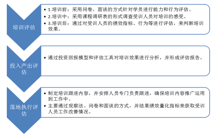 4.培训效果评估体系。科学的效果评估对组织了解培训效果,界定培训对组织的贡献起到至关重要的作用,也可以帮助组织对培训进行全面准确的认识,它是培训工作中不可缺少的重要环节,它涵盖了图6所展示三部分内容。