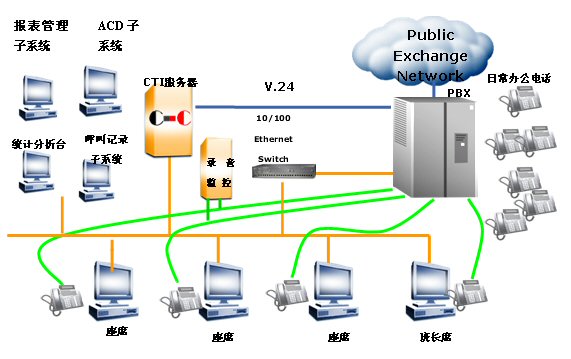 系统采用Siemens Hipath 3750交换机,通过该型号交换机所具有的CTILink接口,向用户提供了完整的呼叫控制功能,能够满足呼叫中心所应有的电话控制的需求;同时提供ACD(自动呼叫分配)功能,实现有效的分配话务。
