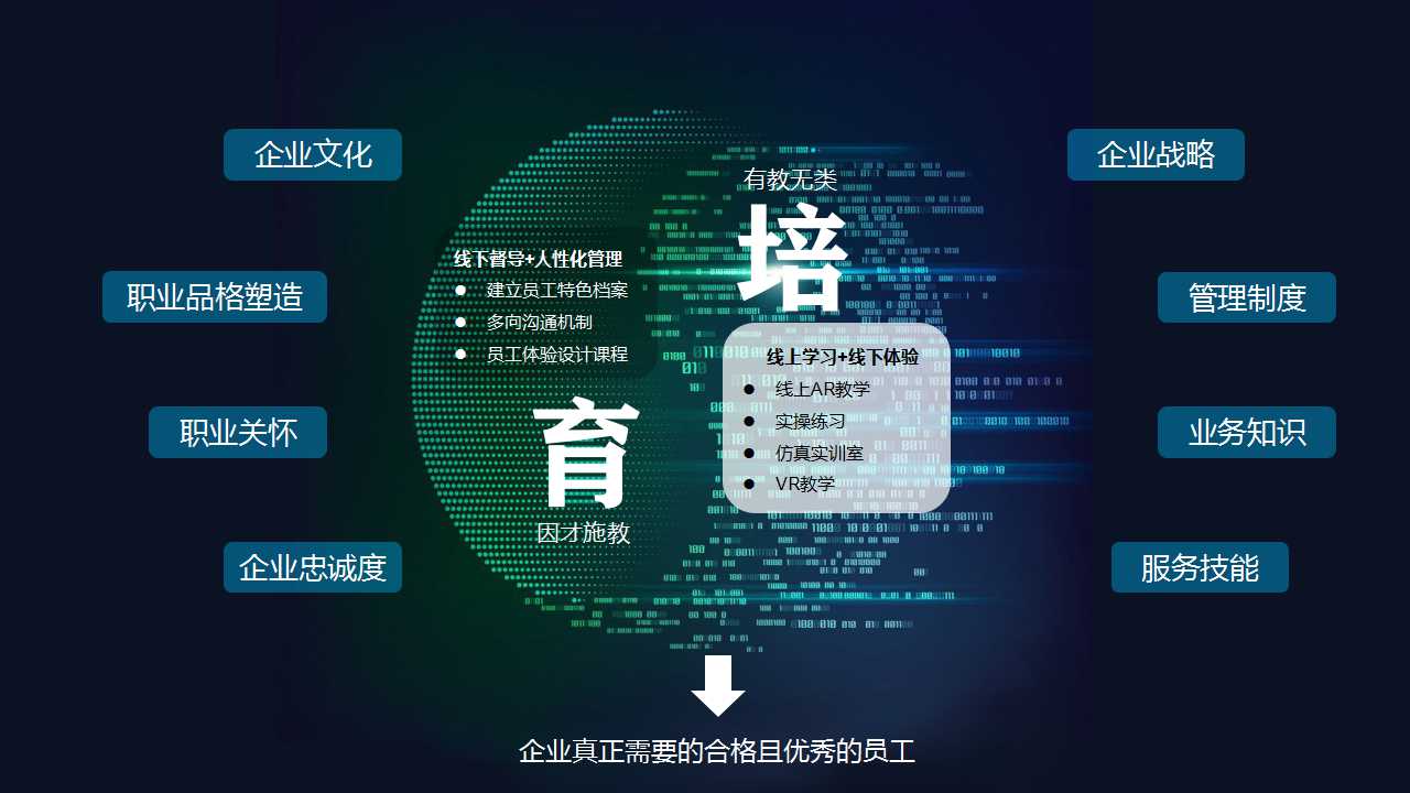 虽然人类使用AI的一大目的是将自己从繁复的基础工作中解放出来,去从事更重要或更有兴趣的事情,但教育非常特殊,它有 “教”和“育”两部分内容。“教”指知识传递,教授学员已知的知识,这部分工作AI可以比人做得更好;“育”指品格培养,鼓励学员去探索未知,去发现、去创造、去爱,而企业想要培育出一名优秀的员工,仅仅“教”,是很难实现优秀人才完整的培养,反而会加大企业的风险,很多员工感受不到企业的关爱,学完知识后,马上远走高飞,因此“育”这部分工作需要我们的培训师去精心完成,为企业培养出高忠诚度、爱岗敬业的好员工提供助力。