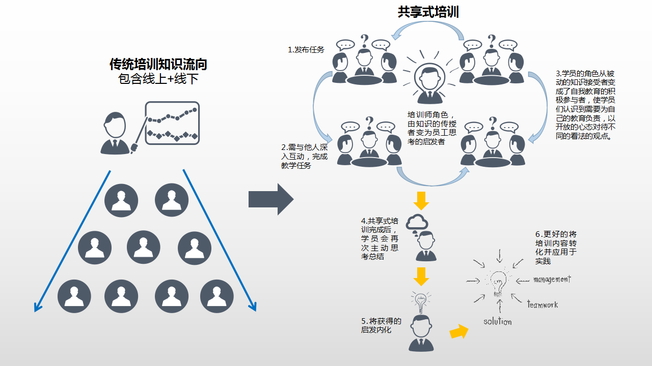 3.培训角色的转变,共享及体验培训颠覆培训效果。