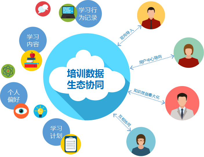 实现信息流的数据化流通,这些信息流包括学习内容、学习计划、学习效果、个人偏好、学习相关行为记录等等。借助大数据技术完成培训数据分析,让数据驱动企业培训的价值创造和传递。同时建立生态协同,以用户为中心的培训模式将原有的单向输出模式重组为价值网模式,在价值网模式中,生态圈里的每一个利益相关方既是某个场景的供方,又是另一个场景中的求方,大家互相协同,将知识效益最大化。