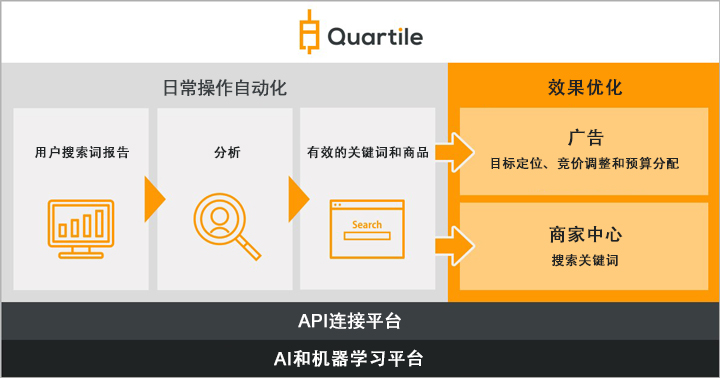 此外,“Quartile”平台采用AI、机器学习和相应的算法,能够无缝连接到Amazon广告API(*)的广告相关数据,通过运用“以AI和机器学习优化广告的(目标定位、竞价调整和预算分配)”、进行“搜索关键字的报告、分析和设置”,使供应商和商家的日常操作实现自动化。