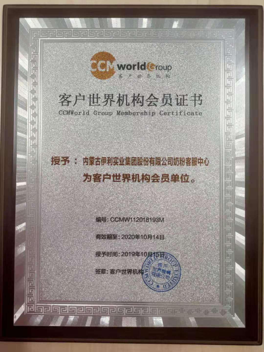 伊利奶粉客户服务中心成为客户世界机构2019/2020年度企业会员