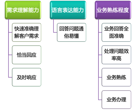 业务能力主要包括理解需求(含快速准确理解客户需求、恰当回应、及时响应)、语言表达(回答问题通俗易懂)、业务熟练(含业务回答全面准确、处理问题效率高、业务熟练、业务办理)的能力。