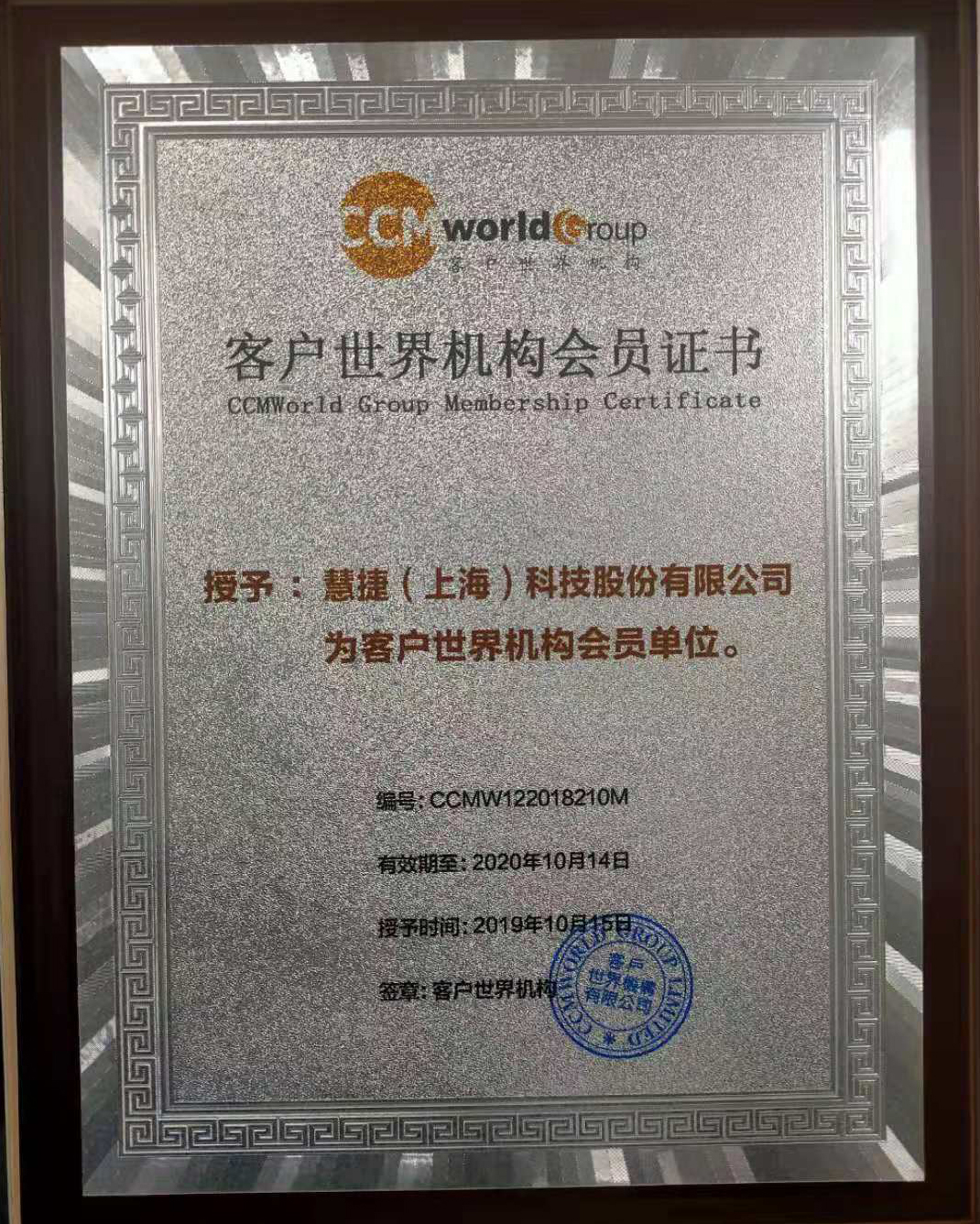 慧捷(上海)科技股份有限公司成为客户世界机构2019/2020年度企业会员