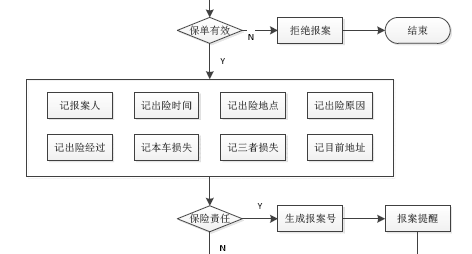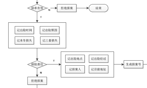 按照上述两个角度,把接报案业务的流程调整为下图所示的样子,从图上可以看出有四个步骤在某些情况下变成不需要记录了。