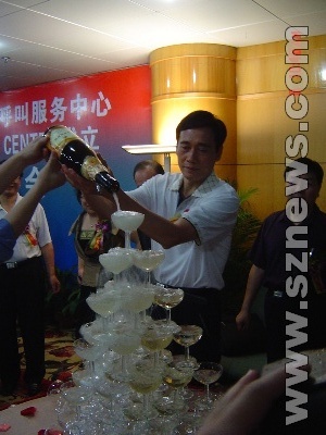 深圳报业集团社长黄扬略为报捷呼叫服务中心成立开香槟庆祝