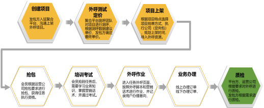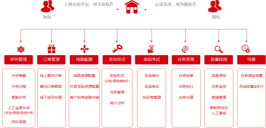 众包平台:平台接入了联通集团6个单位的订单业务,并为在线教育和金融保险行业客户提供服务。在与联通集团合作的过程中,联通发包方将呼叫需求发布到众包平台,平台通过采用知名外包服务商在三四线城市优质坐席资源参与抢包作业,并在生产过程中建立服务质量和生产效能考核制度,确保为客户提供高质量的服务。