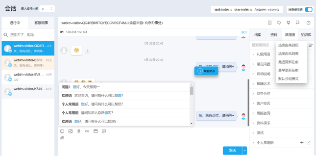 常用语指客服回答访客问题时经常用到的常用话术集。常用语支持智能匹配和智能排序功能,支持根据客服输入内容智能匹配内容,并根据根据使用频率(热度)、更新时间排序,减少客服输入,提高服务效率。