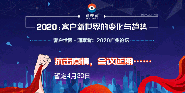各位客户中心行业同仁,由于受到COVID-19疫情的影响,原定于2月25-26日在广州举行的“客户世界-洞察者2020广州论坛”决定延期,暂定于4月29-30日在原定会址举行。