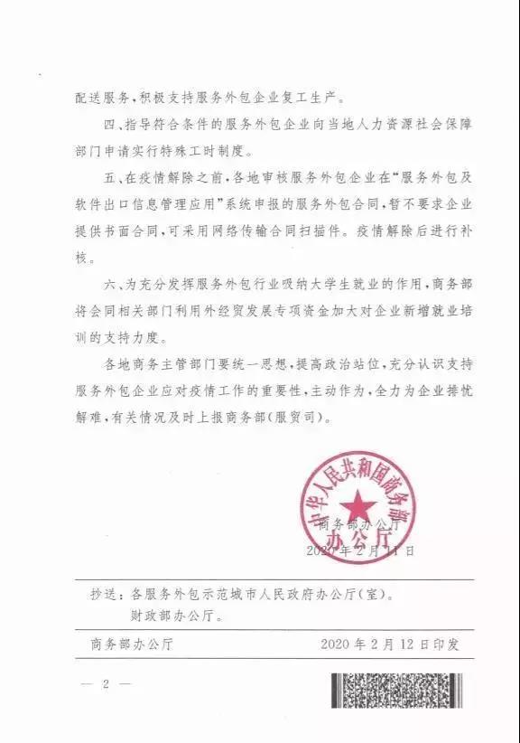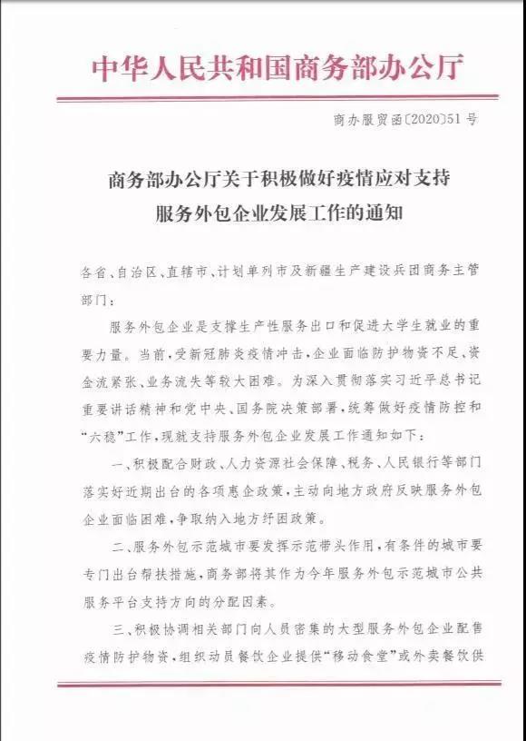 商务部办公厅印发《关于积极做好疫情应对支持服务外包企业发展工作的通知》