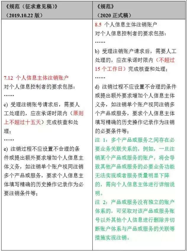 《规范》(2020正式稿)放宽了人工处理注销账号的时间要求,提高了“不应注销单个账户视同注销多个产品或服务”的可执行性。