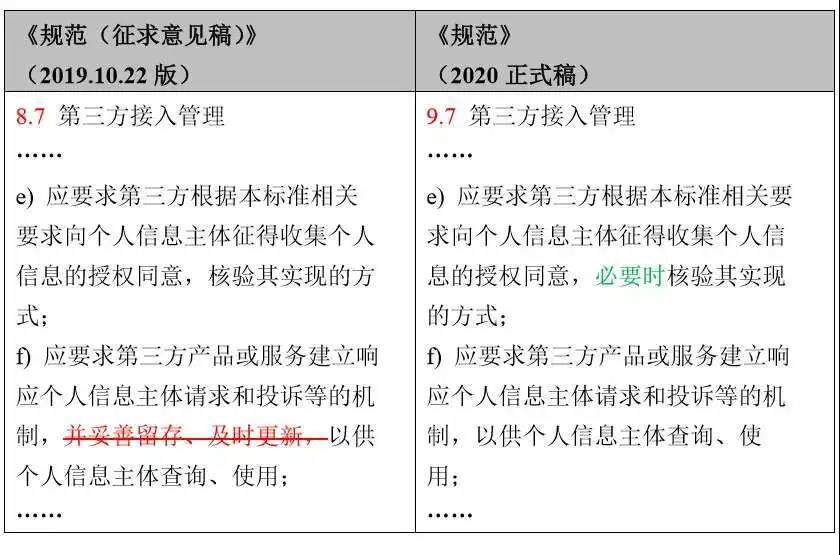 《规范》(2020正式稿)放宽了第三方接入管理中对于核验第三方征得个人信息主体同意的方式的要求,删去了“妥善留存、及时更新第三方产品或服务建立响应个人信息主体请求和投诉等的机制”的要求。