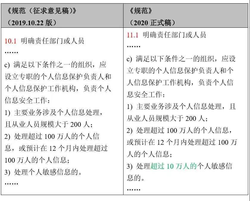 《规范》(2020正式稿)将处理个人敏感信息即需要设立专职的个人信息保护负责人和个人信息保护工作机构,放宽至处理超过10万人的个人敏感信息。实践中,并非多数企业都能触发列举的前两个从业人员规模、处理个人信息数量要求,但一般来说,涉及收集使用个人信息的企业,大多数都会涉及到处理个人敏感信息。如果按照处理个人敏感信息即需要设立专职的要求,可以说,多数企业均需要设置个人信息保护专职负责人和工作机构。而放宽至处理超过10万人的个人敏感信息,能够将一部分企业筛除在外,提高了该等要求的可执行性和科学性。