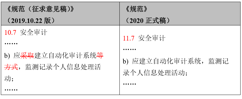 《规范》(2020正式稿)在第11.3条沿用了此前对于个人信息处理活动记录的要求,在第11.7条新增建立自动化审计系统的要求,旨在为监测记录个人信息处理活动提供技术保障。对于自动化审计系统的理解,以个人信息存储在云上为例,部分云服务商提供了数据库审计的服务,可以考虑作为这里的自动化审计系统使用。但是否确切符合《规范》(2020正式稿)规定的自动化审计系统要求,有待监管部门的进一步意见。