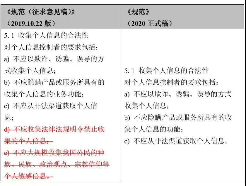 根据条文对比,可以看出,对于收集个人信息的合法性要求,《规范》(2020正式稿)删除了原有的“不应收集法律法规明令禁止收集的个人信息”和“不应大规模收集我国公民的种族、民族、政治观点、宗教信仰等个人敏感信息”的要求。