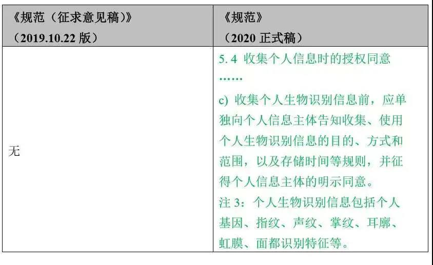 《规范》(2020正式稿)新增了对收集个人生物识别信息的要求。