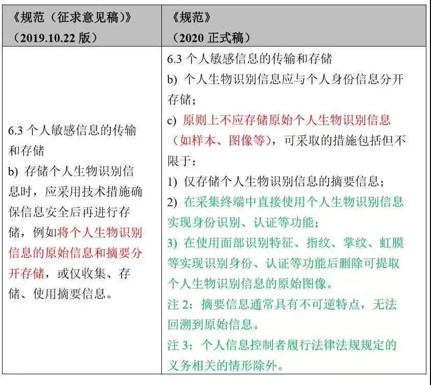 《规范》(2020正式稿)对存储个人生物识别信息,提出了较《规范(征求意见稿)》(2019.10.22版)更为严格的要求。