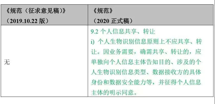 《规范》(2020正式版)新增了对个人生物识别信息共享、转让的要求。
