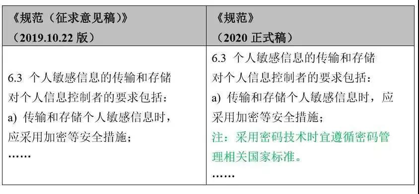 《规范》(2020正式版)新增采用密码技术宜遵循密码管理相关国家标准的要求,按照该等国家标准执行有助于规范密码技术的使用、提高密码的防护能力,更好地保障个人敏感信息的安全。《密码法》已于2020年1月1日生效,其第二十二条强调了建立和完善商用密码标准体系的要求、第二十四条直接指出了“商用密码从业单位开展商用密码活动,应当符合有关法律、行政法规、商用密码强制性国家标准以及该从业单位公开标准的技术要求。国家鼓励商用密码从业单位采用商用密码推荐性国家标准、行业标准,提升商用密码的防护能力,维护用户的合法权益。”可以看出,密码管理相关国家标准的重要性。企业应予以学习、研究和应用。