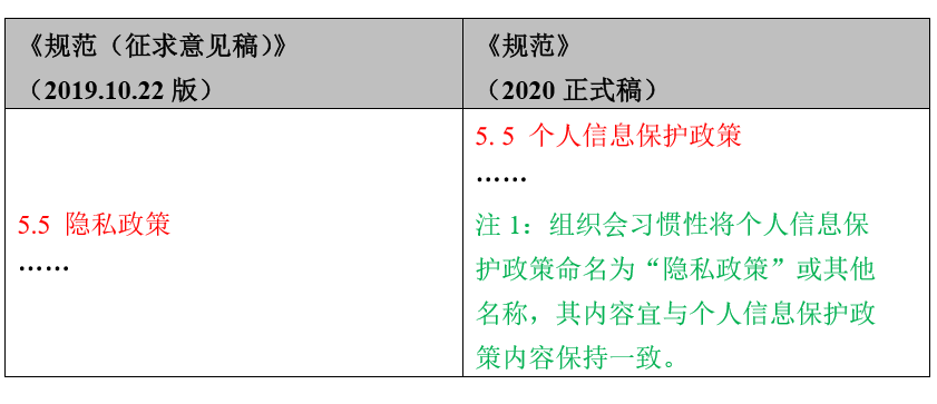 《规范》(2020正式版)将过去版本使用的“隐私政策”和实践中习惯使用的“隐私政策”调整为了“个人信息保护政策”。