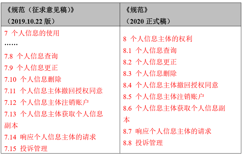 《规范》(2020正式稿)将个人信息主体的权利相关内容,从原来的放置在“个人信息的使用”版块下调整为作为单独条款,结构更加严谨、个人信息主体权利相关内容更加突出。这样的行文安排,与《网络安全法》分别将个人信息使用相关要求规定在第四十一条、将个人信息主体权利相关要求规定在第四十三条,《App违法违规收集使用个人信息行为认定方法》分别将个人信息使用相关要求规定在第三条、将个人信息主体权利相关要求规定在第六条的立法思路保持一致。