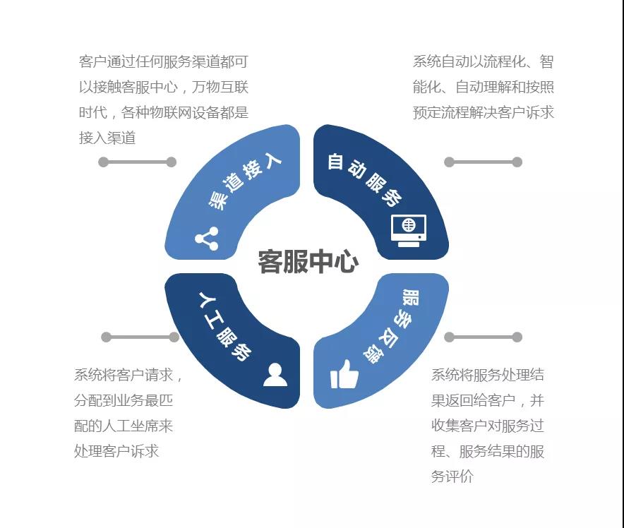 客服中心最核心、最重要的是什么?答案是:渠道接入+自动服务+人工服务+服务反馈。