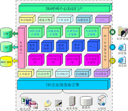 TRS Call Center 知识管理系统构建在TRS企业级搜索引擎之上,融合了TRS文本挖掘技术和内容管理技术,全面包括知识库、竞争情报、专家网络、培训考试、沟通交流和协作交流六大子系统,以及发布管理、审批管理、权限管理、版本控制等系统管理模块;并集成面向用户的网上咨询服务系统,提供面向客户管理信息系统(CRM)、自动语音应答系统(IVR)、Help Desk呼叫记录系统的接口;通过TRS呼叫中心知识门户为坐席提供操作界面。