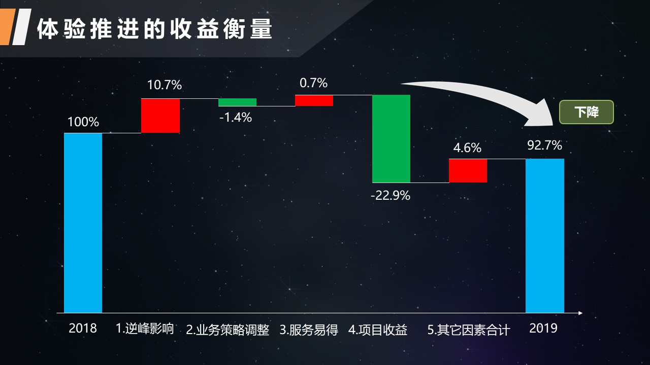 不知道大家有没有仔细的算过体验推进的收益衡量,我们经常用到万订单的人工服务比例来作为收益衡量。在入口合理的情况下,我们会在一个时期内看到每一万张或每一千万张订单的服务比例从一个值下降到另外一个值。此时,需要结合逆峰影响、业务策略调整、服务易得、项目收益等因素进行综合衡量。体验推进的收益衡量可以有效的帮助企业实现体验的提升和成本的降低。下图(图1)是体验推进收益衡量的示例,不代表真实数据,供诸位参考。