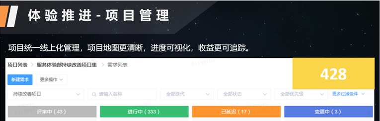 找到合理的项目介入到整个项目的可视化追踪当中,可视化的看板追踪是项目管理中必不可少的工具,否则前面梳理出来的所有东西就会流于空谈。把项目的负责人落实下来,负责人本身会精细化运营这个项目,直到持续改善产生收益,累加在几百个项目当中,对客户体验产生价值和作用的结果。