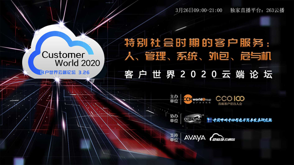 2020年3月26日,客户世界消息:今天,客户世界2020云端论坛在263直播平台圆满举行。本次活动由客户世界机构联合CCO100首席客户官百人会共同主办,CC-CMM国际标准组织、中国呼叫中心与电子商务发展研究院协办,AVAYA(中国)公司、二六三网络通信提供会议支持。本次会议采用12小时超长连续直播的方式进行,共邀请了24位行业重量级嘉宾参与,分为四个主题环节组织分享和研讨。共有超过6万人次行业同仁在云端参与了会议的各个环节,会议取得圆满的成功!