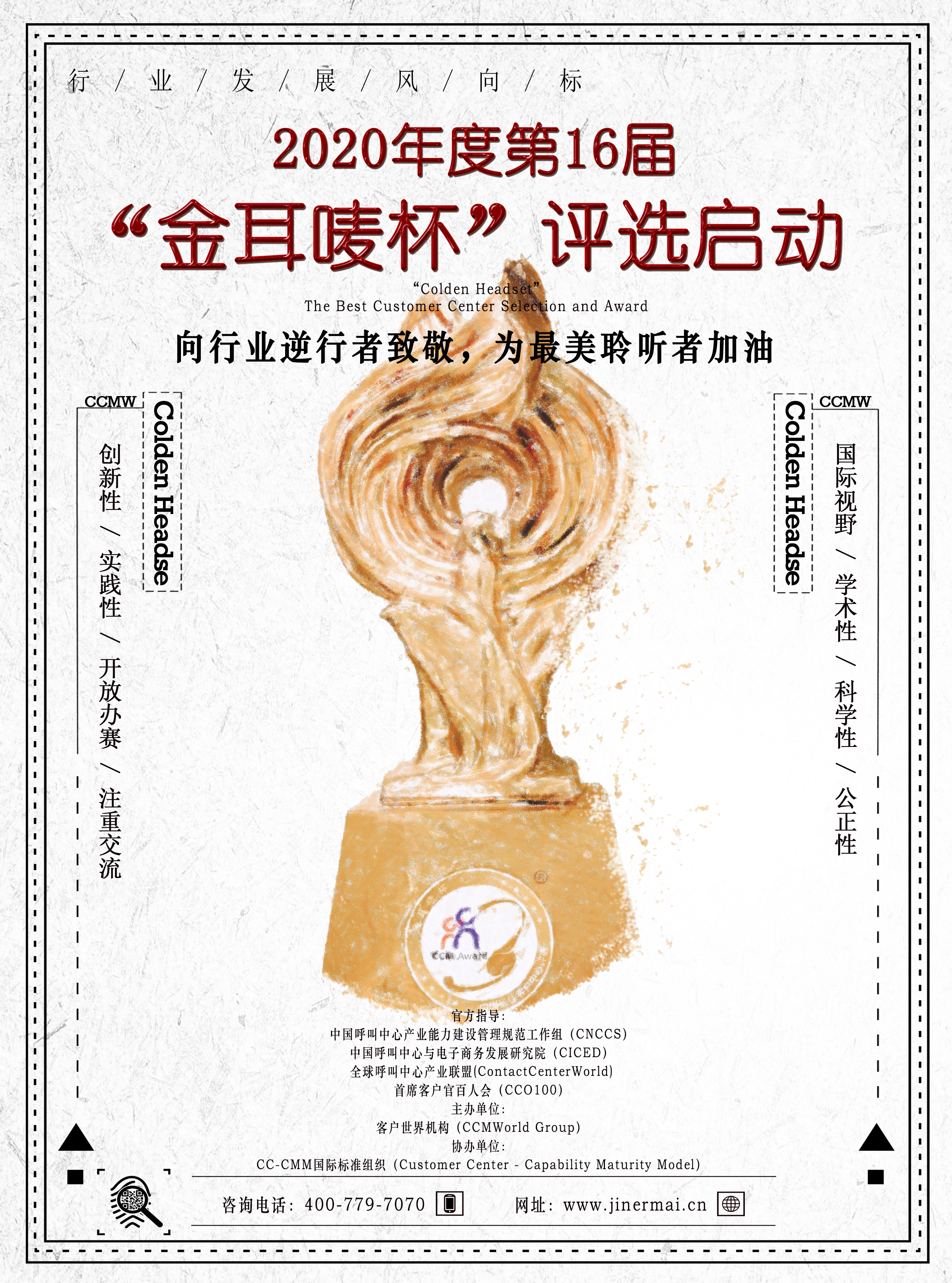 作为此次足以铭刻历史的重大事件的见证者和参与者,客户中心各企业都有自己的创举,展现出过人的勇气和智慧之光。作为行业发展的风向标,具有16年历史的“金耳唛杯”将以庚子年的这场盛典来致敬行业逆行者,礼赞最美聆听者,并为行业全体同仁呐喊加油!