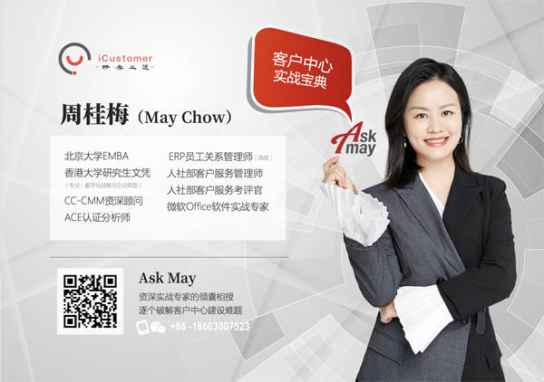 May老师从事客户中心咨询、培训多年,咨询就是一个问我的过程,Ask Me, 我是谁,我是May, 于是有了Ask May这个品牌。在这个专栏里,会和大家来分享平时小伙伴咨询最多的问题或一些关于客户中心管理学习的小知识,小技巧,欢迎大家留言,我们逐个来安排破解。谢谢大家的关注和喜欢。