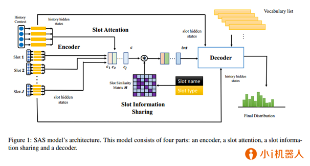 在本篇论文中提出的SAS(Slot Attention and Slot Information Sharing)由两部分构成。第一部分,用槽注意力从历史记录中抽取各个槽所需的关键信息;第二部分,将关键信息根据各个槽的关联性进行信息重组与共享。其中,第二部分有两种不同的实现方法,分别是基于超参数的信息共享和基于k-means的信息共享。SAS 利用注意力机制为独立地每个槽从多轮长对话中提取出最有价值的特征,从而避免不相干槽的冗余信息对目标槽的干扰。其次,为了改善模型在数据不足的槽上的追踪效果,模型共享了关联槽上的信息。在多领域和单领域数据集上的实验结果验证了 SAS在对话状态追踪任务上优于其他方法。