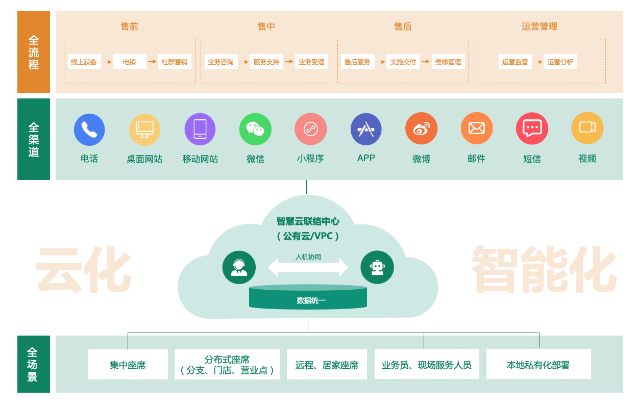 企业全触点接触客户,在售前、售中、售后中的每一个环节,通过PC、微信、APP等全渠道触达客户。