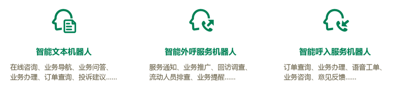 为企业提供的人工智能解决方案中的“智能对话机器人”无疑是企业最为关注的场景。通过语音识别、语义理解、情绪分析、知识图谱、拟人化等人工智能技术应用,有效的帮助企业在全场景、全渠道、全客户联络中进行智能对话服务。根据使用场景可分为智能文本机器人、智能外呼服务机器人、智能呼入服务机器人,广泛应用于企业在线咨询问答、服务通知、业务推广、业务办理、营销,回访调查等业务场景中。