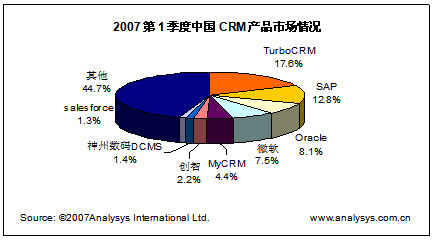 易观国际研究表明,中国CRM产品市场2007年第1季度总体市场规模达到0.79亿人民币,同比季度增长率达达到13%,体现了稳健增长的趋势。具体厂商方面,TurboCRM,SAP,Oracle(甲骨文)位居领先地位。
