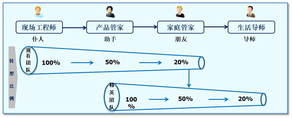 如图2,现场工程师需要逐渐转变成产品管家,到家庭管家,到生活导师,也就是我们咨询领域总说的从做客户的仆人到助手到朋友到导师的转变。我们不要求每个现场服务工程师都能够提升,只要其中一定比例的人员能转型成功即可。另外,我们可以从社会上招募一部分精英团队,来快速完成服务团队的转型过程。