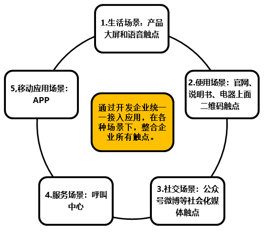 有的企业可以整合的触点多达数百个,而且跨越很多部门,所以建议开发接口应用包,给各类触点提供标准接口,触点通过调用接口可以直接被整合进来。图5介绍了需要整合的5类服务触点。