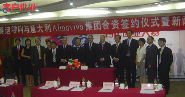 2007年6月18日,北京。[客户世界消息]:今天下午,赛迪呼叫与意大利AlmavivA集团的合资签约仪式在赛迪大厦举行。此次合作对赛迪呼叫来说,意义非同寻常,对中国呼叫外包市场也将起到一定的推动作用。