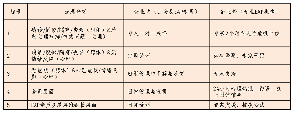 1、确诊/疑似/隔离/丧亲(躯体)&严重心理疾病/情绪问题(心理):分公司领导层、工会或EAP专员专人一对一关怀。同时专家远程实时待命,如需心理危机干预支撑,及时提供帮助。