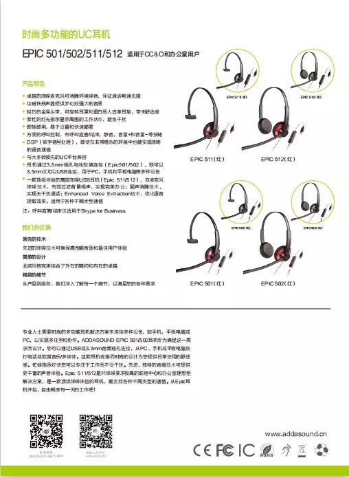 艾德声(ADDASOUND),致力于打造交互式智能语音终端,以“用声音改变世界”为宗旨和使命,在自身声学技术深厚积累的基础上,广泛与众多高科技企业和研究机构合作,实现了从呼叫中心、统一通信解决方案到消费类蓝牙耳麦等产品线的全覆盖。目前,艾德声(ADDASOUND)的耳机产品市场遍及全球多个国家,长期为金融、保险、医疗健康、通信、电子商务等行业的呼叫中心提供产品支持。