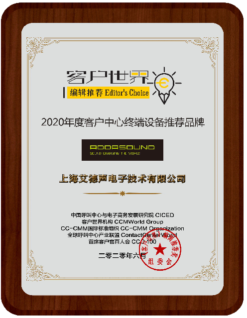 恭喜艾德声(ADDASOUND)( 上海艾德声电子技术有限公司 )荣获《客户世界》2020年度编辑推荐客户中心终端设备推荐品牌,艾德声已经连续两年获此殊荣,同时也是今年三大获奖单位之一!